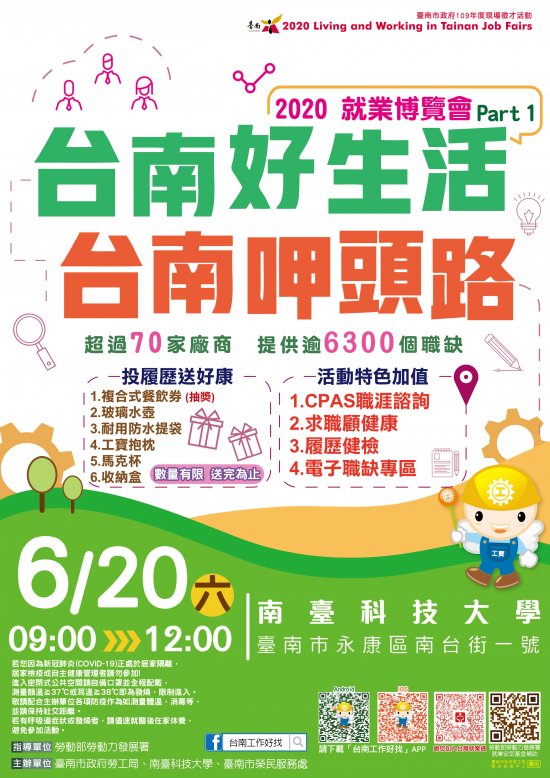 臺南市政府勞工局職訓就服中心將於 109 年 6 月 20 日(週六)假永康區南臺科技大學辦理 2020「台南好生活 台南呷頭路」Part1 就業博覽會活動,當日超過 70 家廠商,提供逾 6300 個工作機會;活動當天有「投履歷送好康」、「CPAS 職涯諮詢」、「求職顧健康」、「履歷健檢」、「按摩紓壓」及「美髮水噹噹」等多項免費服務,詳洽: 06-6330820 。