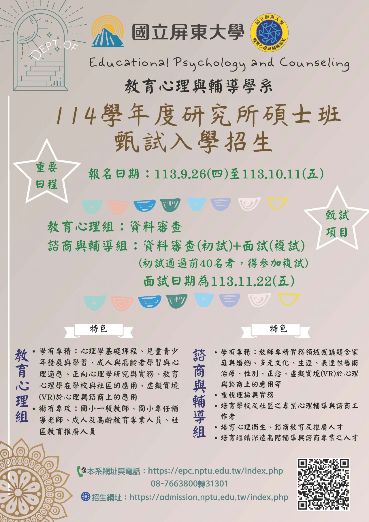 國立屏東大學教育心理與輔導學系114學年度日間碩士班甄試招生相關資訊1130925