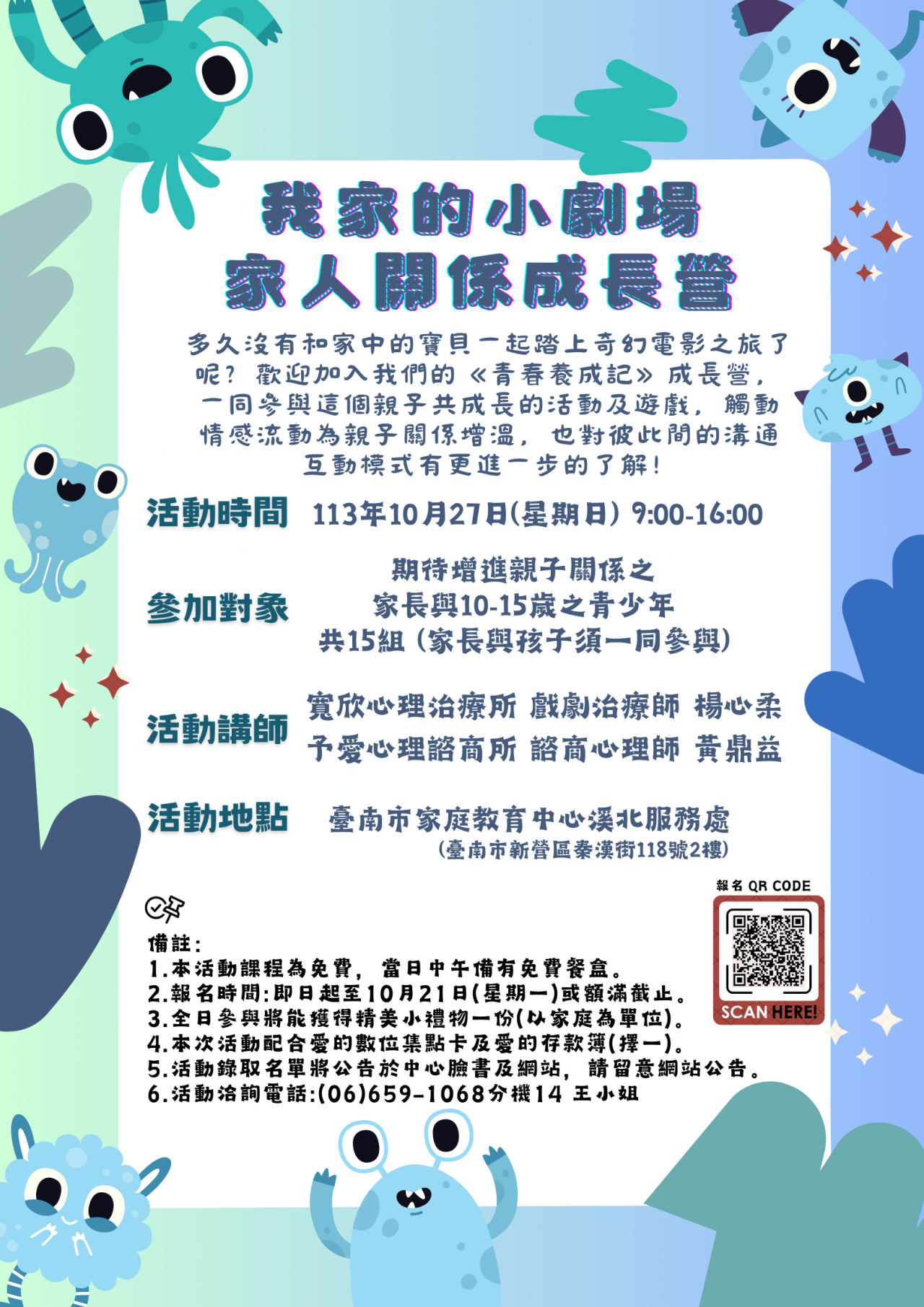二、 旨案活動由臺南市家庭教育中心於本(113)年 10 月 27 日(星期日)辦理「我家的小劇場-家人關係成長營」(溪北場),歡迎期待增進親子關係之家長與 10-15 歲青少年踴躍參加。