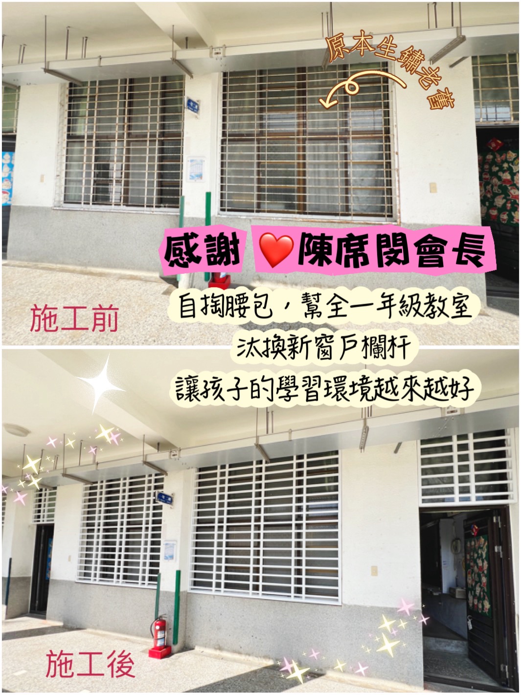 勝利是一所歷史悠久的老學校,校舍設備隨著歲月使用,逐步需要更新與改善。感謝陳會長於了解學校實際需求後,再次主動自掏腰包,協助自強樓一年級整排教室全面更換窗戶欄杆,為孩子們打造更安全、舒適的學習空間。
