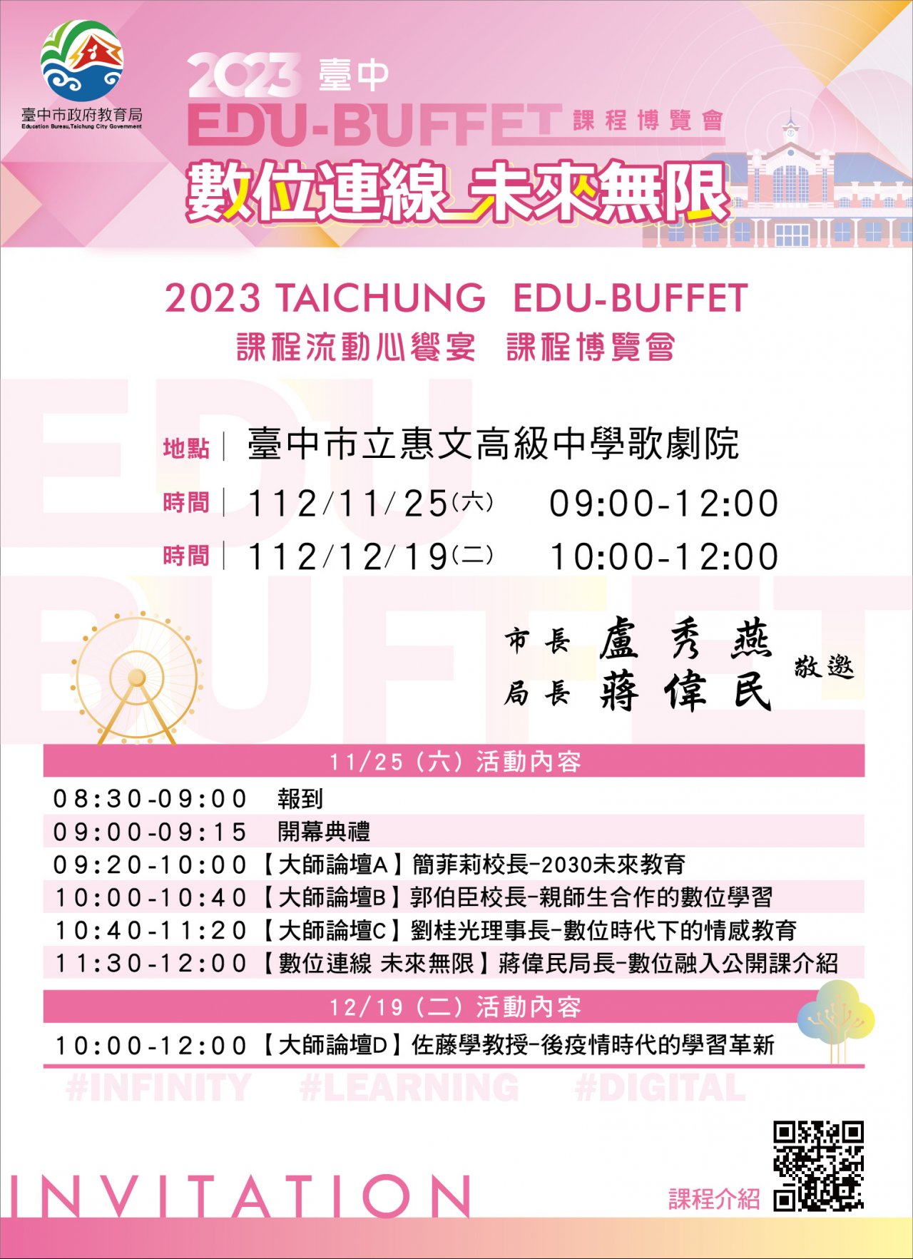 二、 2023 臺中 EDU-BUFFET 課程博覽會以「數位連線 未來無限」為主題,期待與各縣市學校、教師及家長們,共同交流課程研創與數位融入教學實踐之經驗,歡迎教育夥伴共襄盛舉,體驗臺中多元豐富教育力。