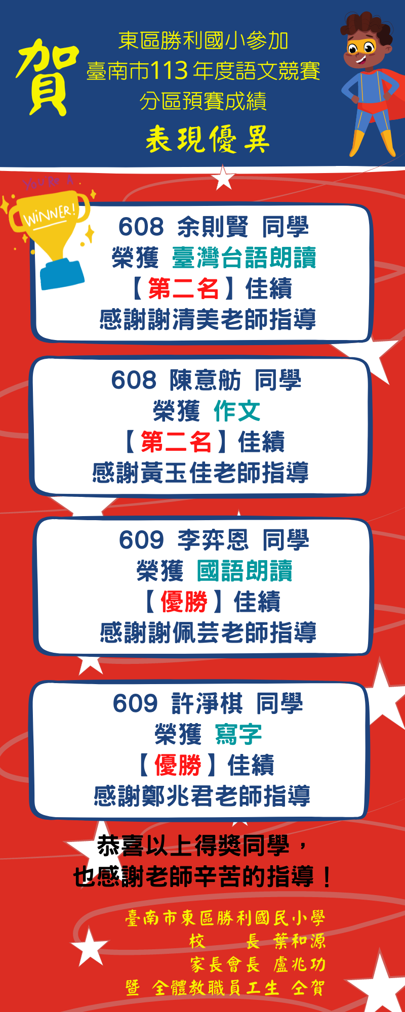 賀!608 余則賢等四位同學參加臺南市 113 學年度語文競賽-分區預賽榮獲佳績,成績如下: