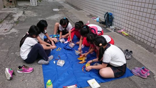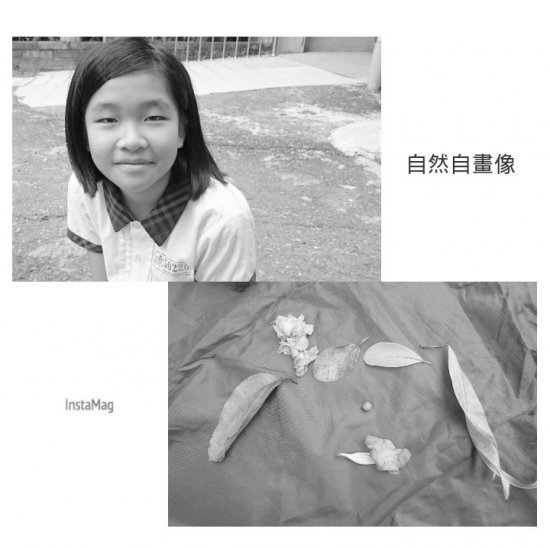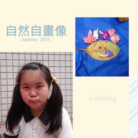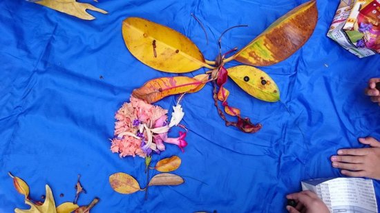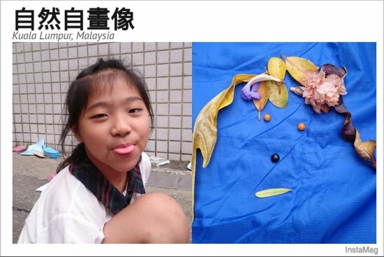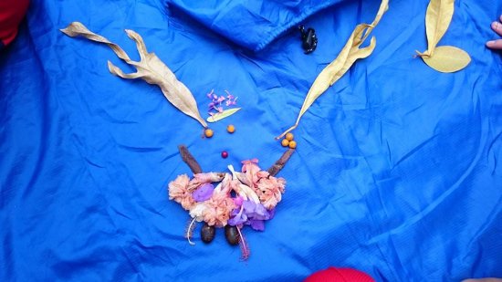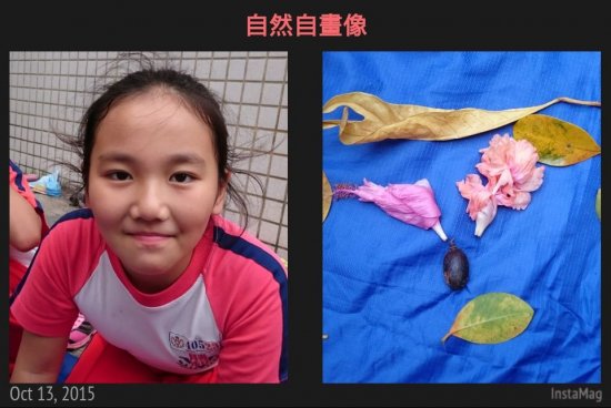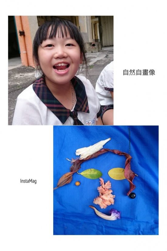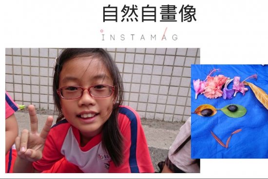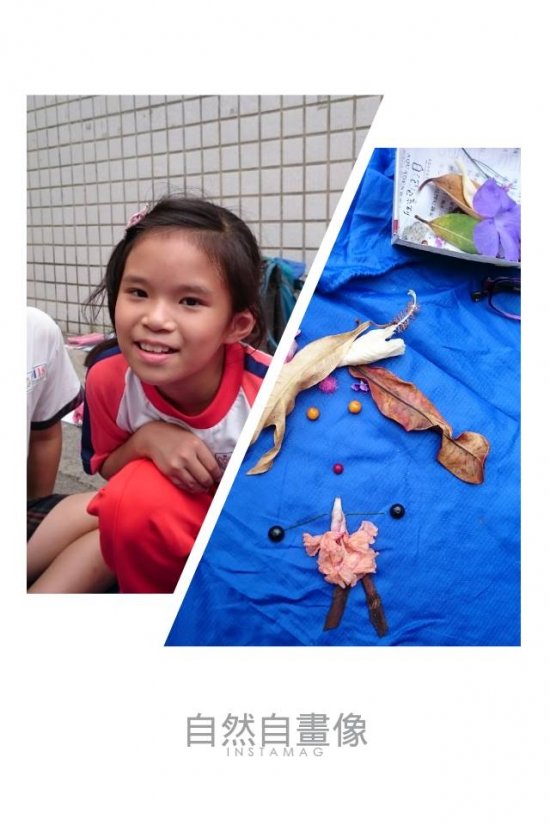 一邊彎腰撿拾…一邊觀察認識植物 搜集自然喜歡的顏色形狀 想像照著鏡子…看見自然裡的自己 拼一張自然自畫像…有像嗎?! 後分兩組集團創作…有點像有點萌!!