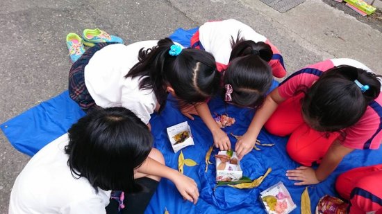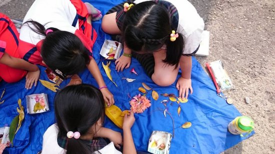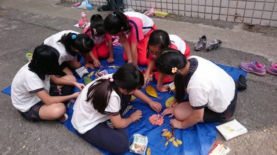 短短的午休時間,野馬老師帶著解說員們在校園裡撿拾植物,一邊認識植物。最後利用撿拾的成果拼出自然自畫像,這群解說員很有創造力呢!拼的畫像都有把自己的特色表現出來!
