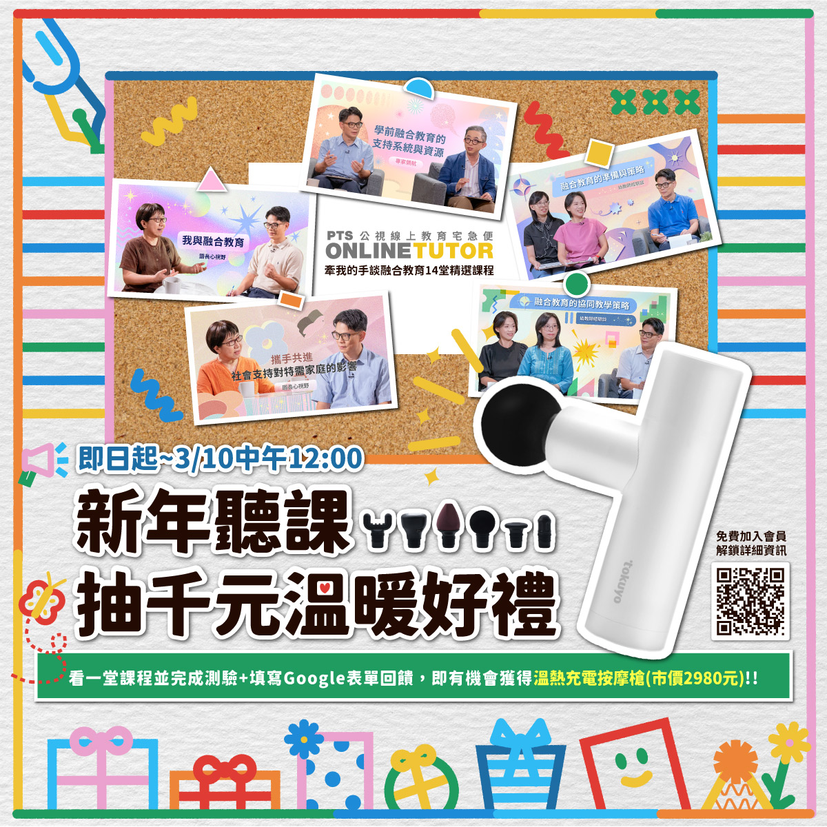 (一)為鼓勵教師參與線上研習課程,「公視兒少教育資源網」舉辦研習抽獎活動,即日起至 3/10(一)中午 12:00 止,歡迎教師踴躍參加。