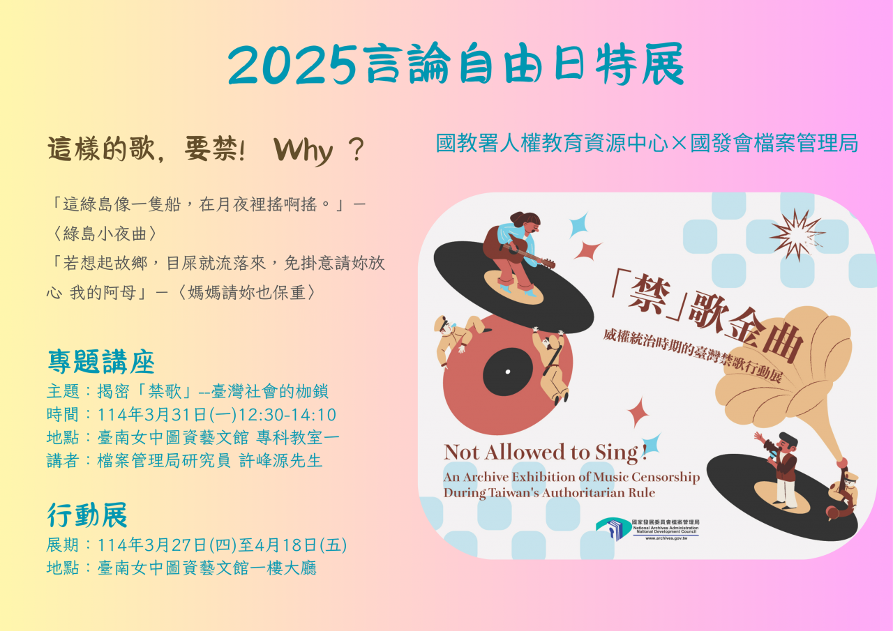 一、主旨:為紀念言論自由日,國教署人權教育資源中心與國家發展委員會檔案管理局共同辦理「禁歌金曲:威權統治時期的台灣禁歌」行動展暨講座,敬邀本市人權教育輔導團教師出席參與。