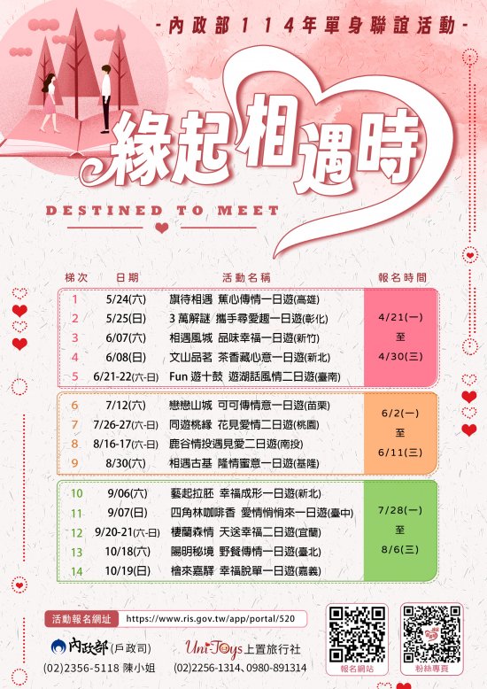 內政部114年「緣起相遇時」單身聯誼活動登場,共14梯次,歡迎踴躍參與,詳情請參閱內政部戶政司全球資訊網(https://www.ris.gov.tw/app/portal/520)