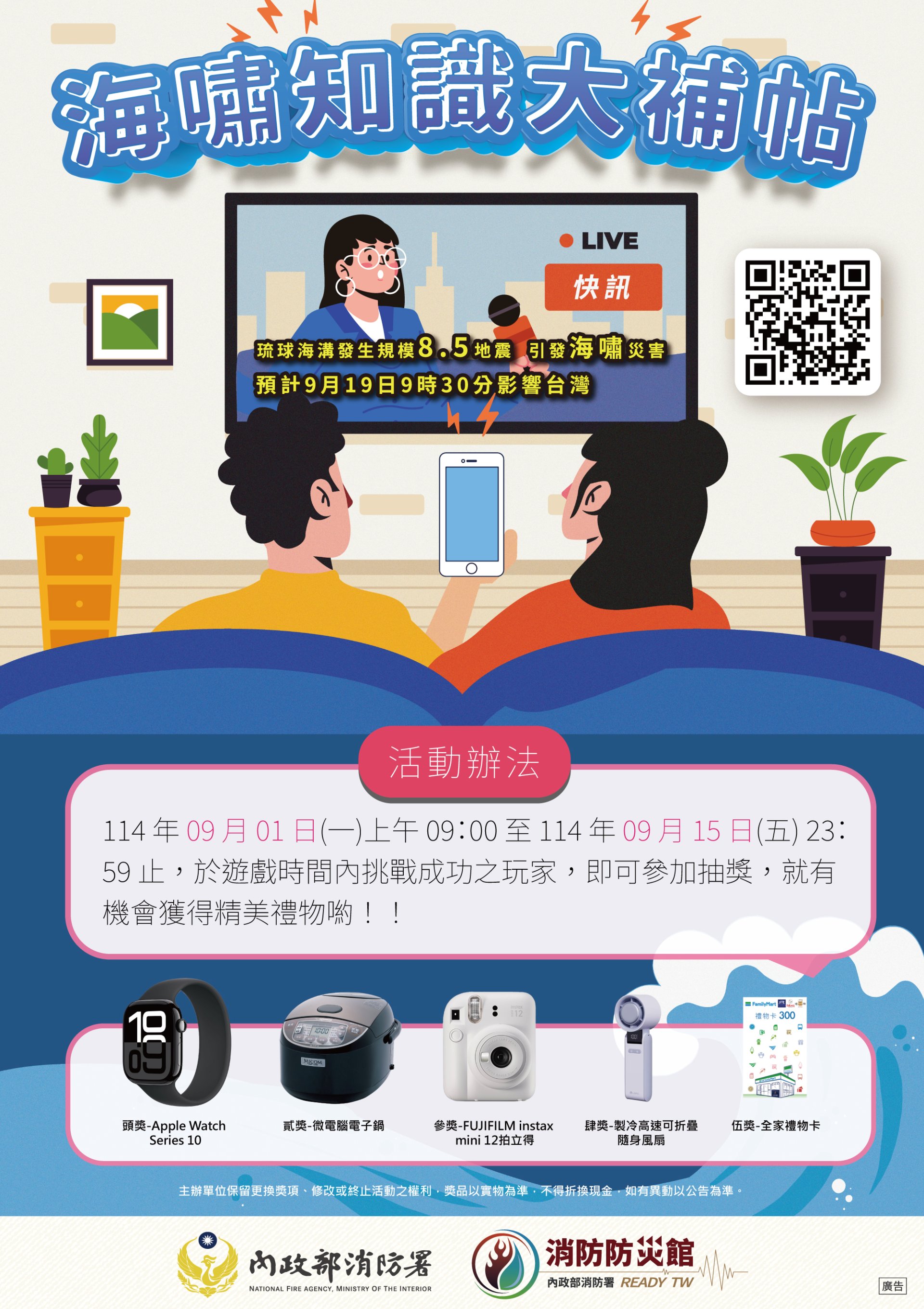 每年 9 月 21 日是國家防災日, 9 月更是重要的防災準備月,為提醒民眾加強防災意識,於 114 年 9 月 1 日至 10 月 31 日止辦理全國防震避難演練。