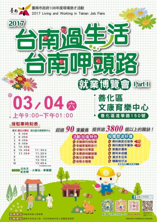 2017「台南過生活 台南呷頭路」Part1 就業博覽會,將在 3 月 4 日(六)上午 9 時於善化區文康育樂中心辦理,當日超過 90 家廠商,提供逾 3800 個工作機會;活動當天有「投履歷送好康」、「面試模擬」、「按摩舒壓」、「求職順利接駁車」、「幸福草莓輕旅行」、「求職托兒 專區」、「免費篩檢顧健康」、「數位求職專區」及「妝髮水噹噹」等多項免費服務,並可抽知名飯店住宿券及早餐券,詳洽: 06-6330820 。