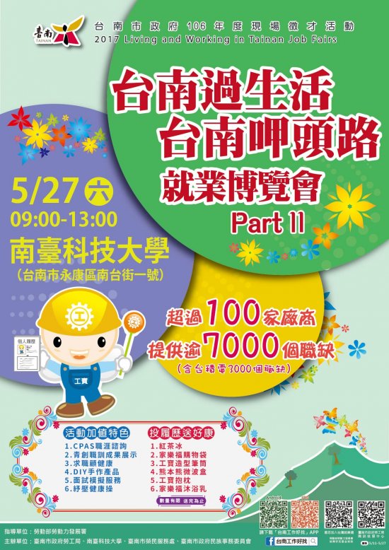 2017「台南過生活 台南呷頭路」Part2 就業博覽會,將在 5 月 27 日(六)上午 9 時於永康區南臺科技大學辦理,當日超過 100 家廠商,提供逾 7000 個工作機會;活動當天有「投履歷送好康」、「按摩紓壓」、「CPAS 職涯諮詢」、「DIY 手作產品」、「求職托兒專區」、「免費篩檢顧健康」、「紓壓健康操」及「妝髮水噹噹」等多項免費服務,詳洽: 06-6330820 。