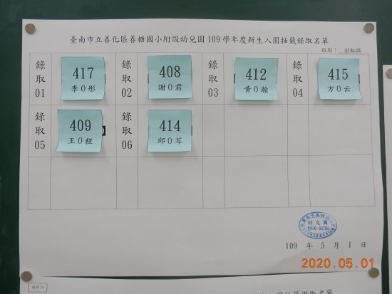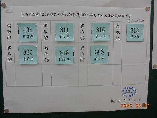 善糖附幼109學年度新生入園抽籤錄取名單及備取名單
