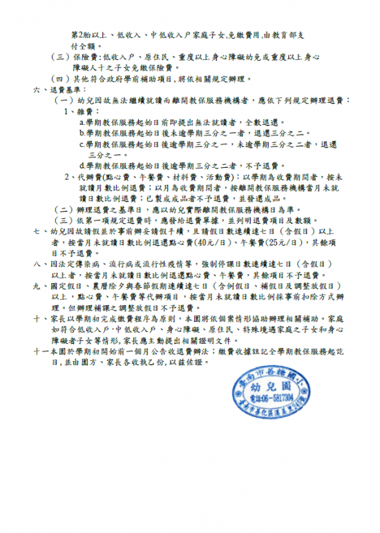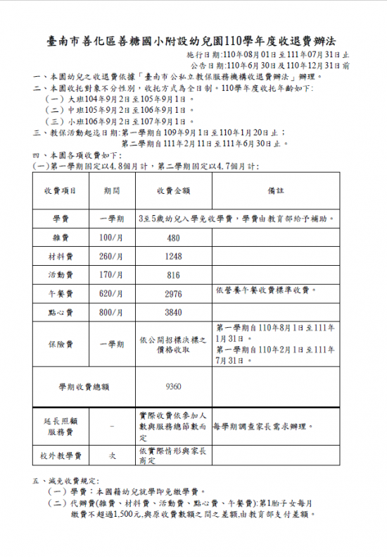 善糖國小附設幼兒園附幼110學年度收退費辦法
