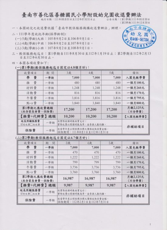 善糖國小附設幼兒園111學年度收退費收退費辦法