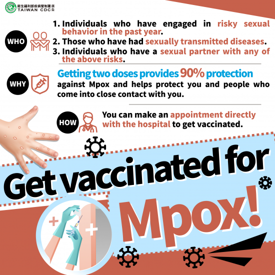 三、有關 Mpox 防治與疫苗接種相關衛教文宣、教材或影片等資訊,可至本署全球資訊網(http://www.cdc.gov.tw)/猴痘專區項下
