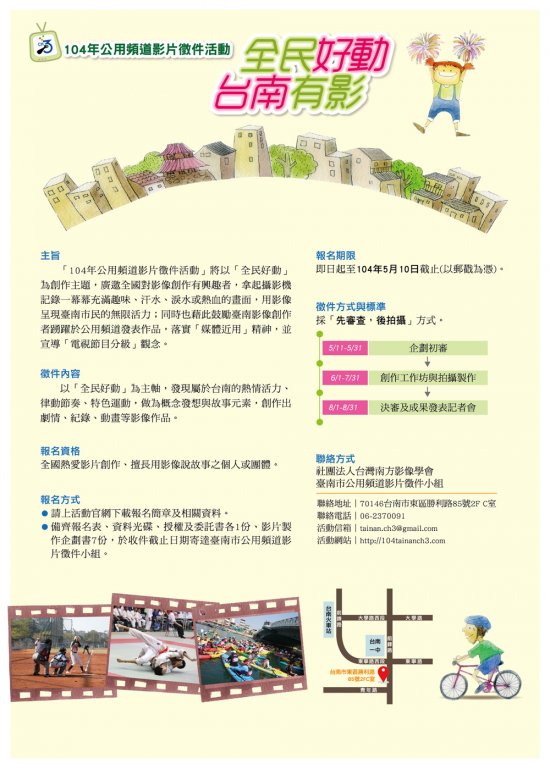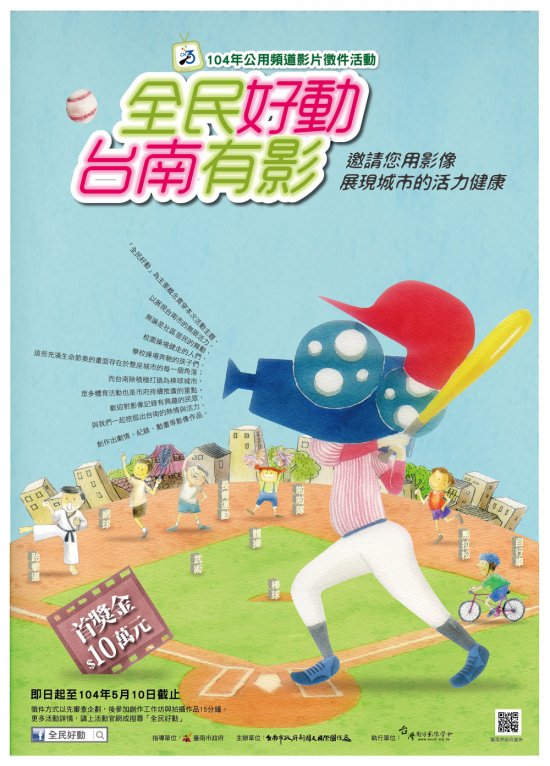 「104 年公用頻道影片徵件活動-全民好動」邀請您用影像捕捉臺南的無限活力,首獎獎金 10 萬元!徵件至 5 月 10 日止。