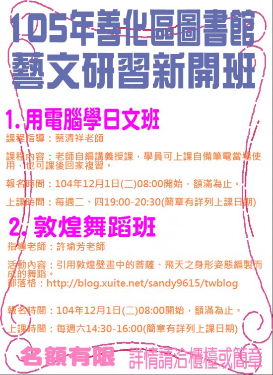 圖書館105上半年藝文推廣活動新開設「用電腦學日文班」及「敦煌舞蹈班」海報1份如附件