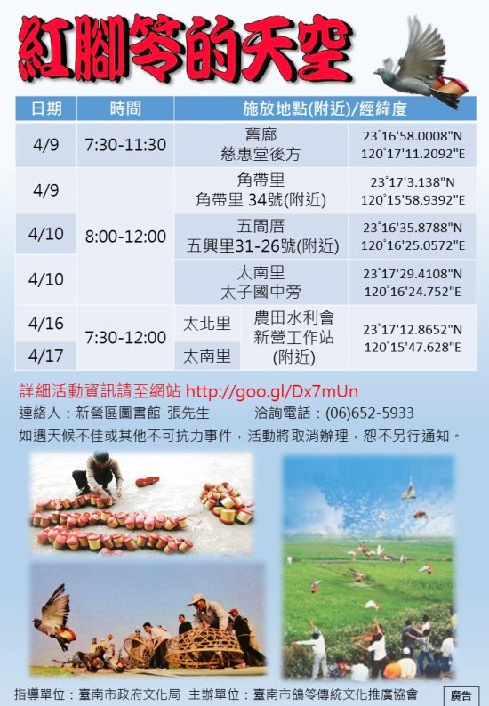 說明: 一、活動日期: 105 年 4 月 9 日、 4 月 10 日、 4 月 16 日及 4 月 17 日。 二、活動地點:臺南市新營區(如附活動行程表及 DM )。 三、活動費用:全程免費。 四、詳細活動資訊請至網站( http://goo.gl/Dx7mUn )。 五、檢附『臺南市新營區西部采風-紅腳笭的天空自助旅行』活動行程表及 DM