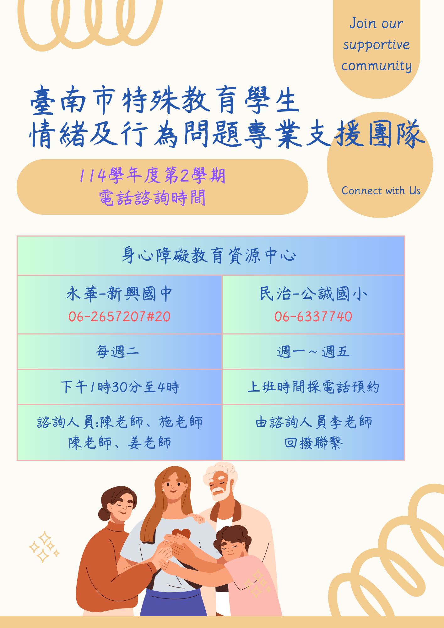 三、114學年度第2學期情支團隊電話諮詢時間如下: