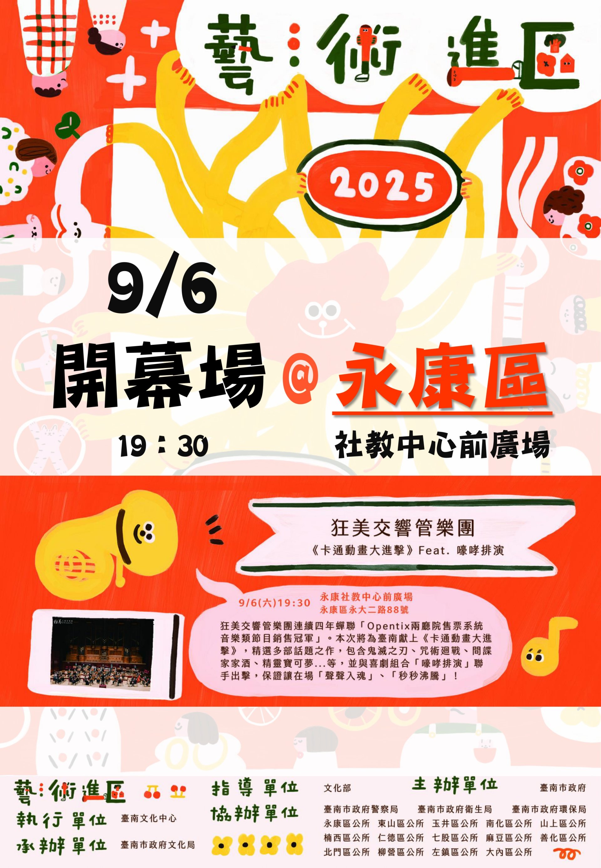 二、本場活動之演出單位「狂美交響管樂團」,連續四年蟬聯「Opentix兩廳院售票系統音樂類節目銷售冠軍」,本次將為臺南獻上《卡通動畫大進擊》,精選多部話題之作,包含鬼滅之刃、咒術迴戰、間諜家家酒、精靈寶可夢等,並與喜劇組合「嚎哮排演」聯手出擊,精彩可期。
