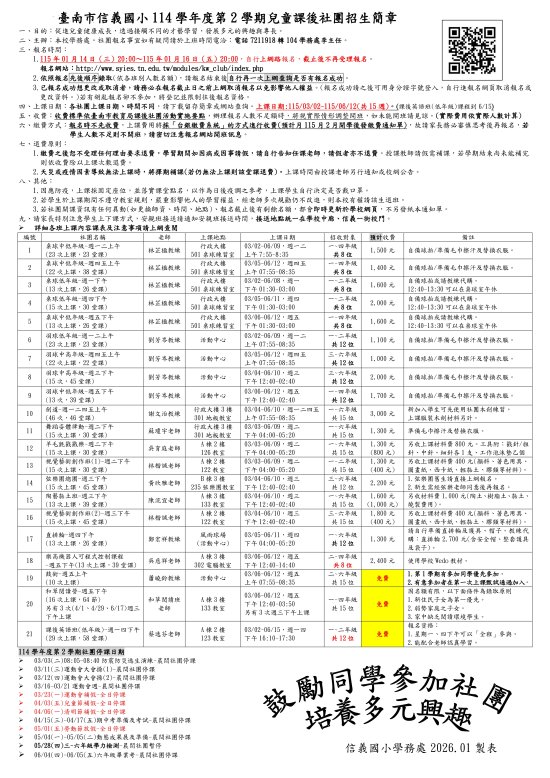 二、上課日期:各社團上課日期、時間不同,請下載留存簡章或網站查詢。上課日期:115/03/02-115/06/12(共 15 週)。(課後英語班(低年級)課程到 6/15)