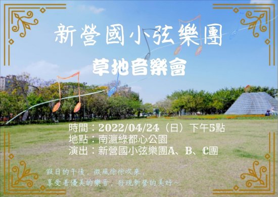 演出: 新營國小弦樂團 A 、 B 、 C 團 誠摯邀請您 一起到綠都心走走,度過悠閒美好的音樂時光~