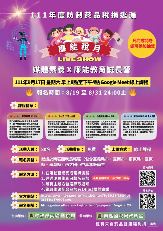 (四) 報名期間:自 111 年 8 月 19 日(星期五)10:00 起至 8 月 31 日(星期三)24:00 止,詳細報名資訊參見財政部南區國稅局官方網站活動專區 (https://www.ntbsa.gov.tw/multiplehtml/be55c33f25804c438918ca379006bae1)。