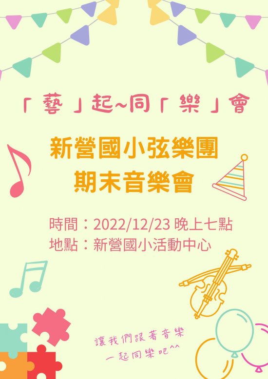 本校弦樂團將於111/12/23(五)19:00,舉辦「藝起同樂期末發表會」,誠摯邀請您到場欣賞孩子們的演出!