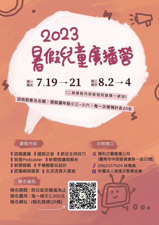 一、為豐富國小學童暑期多元學習面貌,本會結合勝利之聲廣播公司、電聲廣播電台、俊逸慈善基金會辦理「2023 暑假兒童廣播營」。 二、相關課程內容、研習費用以及線上報名資訊,請至俊逸文教基金會網站→「活動報名」專區(網址: http://www.e-go.org.tw/e-go/event_list.asp)查詢。 三、活動簡章 1 份請見附檔