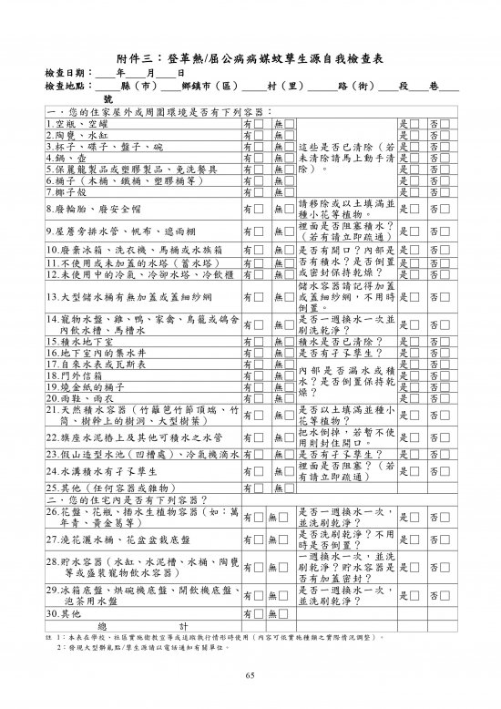3.附件為「病媒蚊孳生源自我檢查表」請學生在家確實執行,並加強清除住家戶內外之積水容器及孳生源。