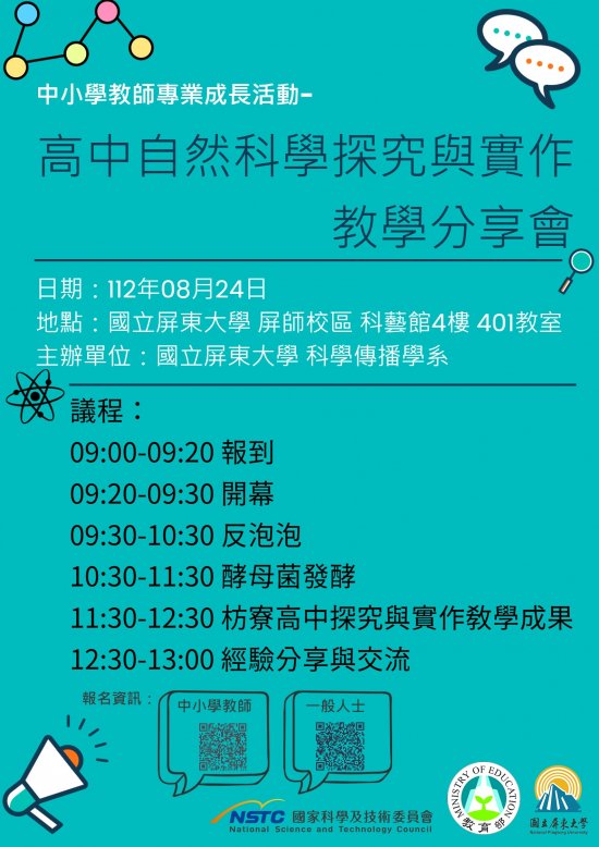 一、活動目的:與高中教師攜手合作,依據教師現況與需求為起點,設計與實施教師專業成長課程,探索參與教師教學實務、專業成長及學生學習改變,期待從提升探究教學品質,共同有效地促進學生學習發展,培育學生科學素養。 二、辦理時間: 112 年 8 月 24 日(星期四)上午 9 時至 13 時 00 分。 三、地點:國立屏東大學屏師校區-科藝館 4 樓 401 教室。 四、活動對象:全國教師,全程參與人員給予 3 小時研習時數。 五、報名方式:請逕至全國教師在職進修網報名。