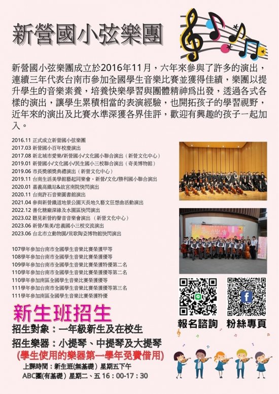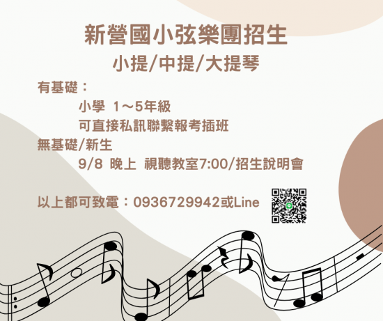 弦樂團將於 9/8 晚上七點在本校視聽教室舉辦招生說明會,歡迎有興趣的家長帶著孩子來聆聽說明喔!
