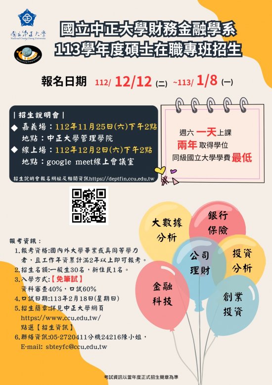 (一)嘉義場: 112 年 11 月 25 日(星期六)下午 2 點,地點:中正大學管理學院。
