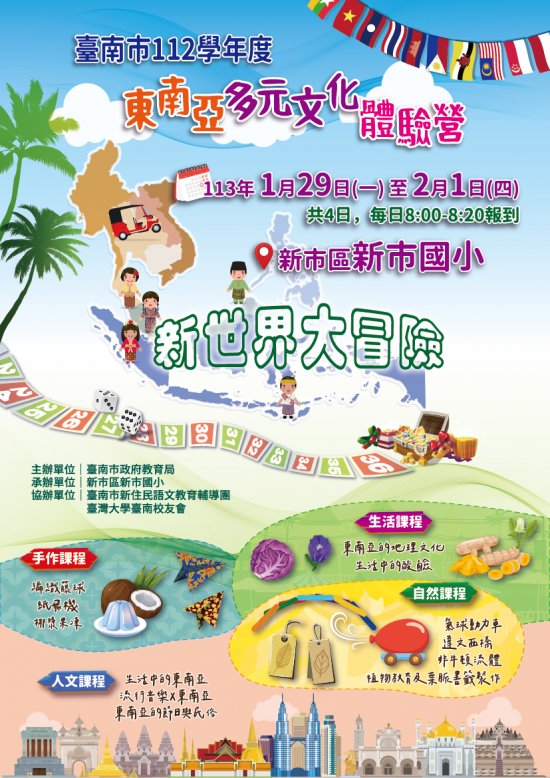 (一)活動內容:本次營隊與臺灣大學臺南校友會合作,以「新世界大冒險」作為副標,上午以寓教於樂的方式,將東南亞特產植物、習俗、流行音樂等結合科普、人文、生活及手作等課程;下午則以大地遊戲與闖關活動,進行國際教育及教導學生團隊合作精神,內化多元文化理解尊重之價值觀念。