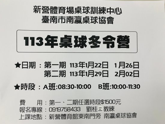 113 年桌球冬令營(臺南市南瀛桌球協會辦理)