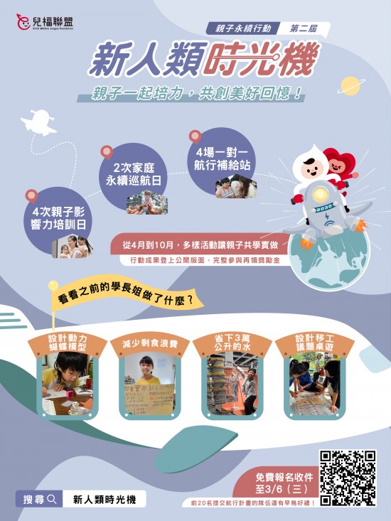 《新人類時光機》是以家庭為單位的永續行動培力計畫,我們希望透過親子共學培養孩子的觀察、同理能力,並讓親子在過程中一同練習關懷世界,接觸更多元的永續發展( Sustainable Development )議題,建立孩子的國際視野並培養孩子的素養與問題解決能力,預計本屆將選出 10 至 15 組隊伍,透過專業師資帶領的設計思考共學工作坊、多元的戶外參訪體驗活動、一對一的永續行動方案指導會議等等,激發孩子系統思考、解決問題以及規劃執行的能力,發想創新永續行動方案,來解決觀察到的問題困境。參與本次計畫不需要繳交任何費用,但須確保能參與所有計畫的課程內容,計畫期間僅能請假 1 次,自 1 月 2 日(二)起開放線上填寫報名表申請,截止日期為 3 月 6 日(三),報名申請網站: https://bit.ly/48o7eFe