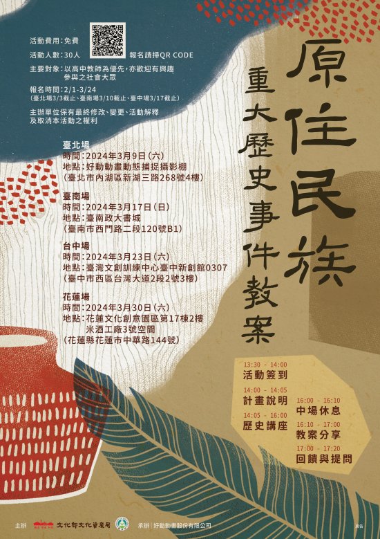 二、為使社會大眾更容易且廣泛認識原住民族歷史,辦理「原住民族重大歷史事件教案工作坊」活動。