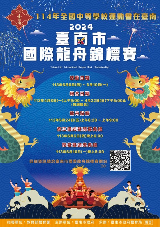 二、報名方式:採網路報名,自 113 年 4 月 8 日(星期一)上午 9 時起至 4 月 22 日(星期一)下午 5 時止(報名網址:https://dragonboat.tainan.gov.tw/)。