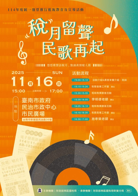 114 年度統一發票推行租稅教育及宣導活動-「稅月留聲~民歌再起」,歡迎踴躍參加