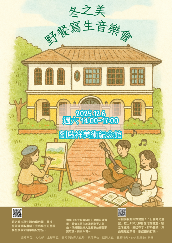 一、秉持劉啟祥老師推廣美術教育之精神,本局自劉啟祥美術紀念館開館後,不定期舉辦各項展覽活動,活絡在地藝文。本次活動結合野餐、兒童寫生及音樂表演,邀請民眾共享冬日藝文野餐時光。