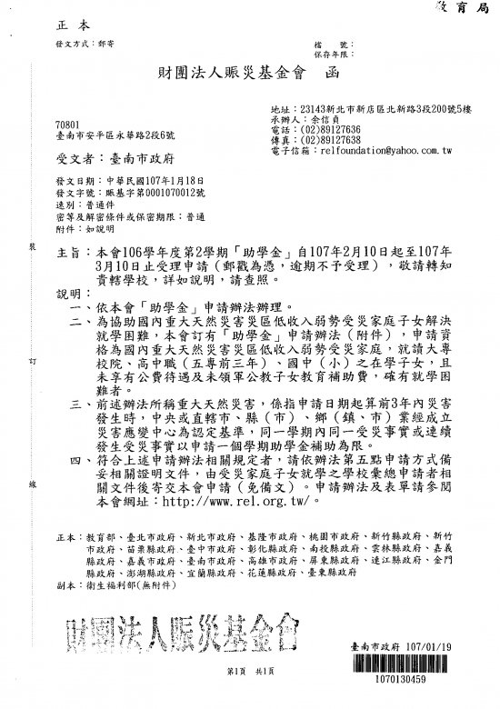 財團法人賑災基金會106學年度第2學期「助學金」相關資料。