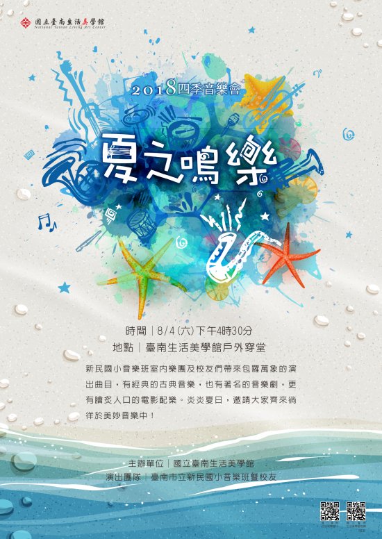 一、本活動係邀請「臺南市新民國小音樂班暨校友」擔任演出,將帶來經典的古典音樂、膾炙人口的電影與音樂劇配樂。炎炎夏日,邀請大家齊來徜徉於美妙音樂中! 二、演出時間: 8 月 4 日(週六)下午 4 時 30 分至 5 時 30 分,地點:國立臺南生活美學館戶外穿堂(自由入座)。 三、活動新聞稿及海報圖檔詳如附件。