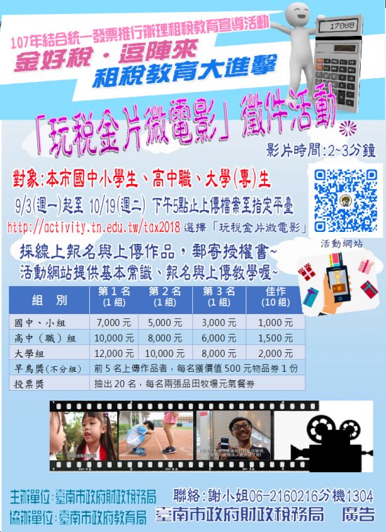 三、活動內容:邀請本市國中小、高中職學生、大學(專)校生,以「稅收對公共建設及社會福利等之影響」、「使用行動支付消費結合雲端發票」、「納稅者權利保護法」等主題擇一創作,採線上報名與上傳作品方式,請參閱活動網站 http://activity.tn.edu.tw/tax2018 「玩稅金片微電影」,旨揭活動獎勵辦法豐富,請協助刊登活動訊息並鼓勵學生踴躍參加。