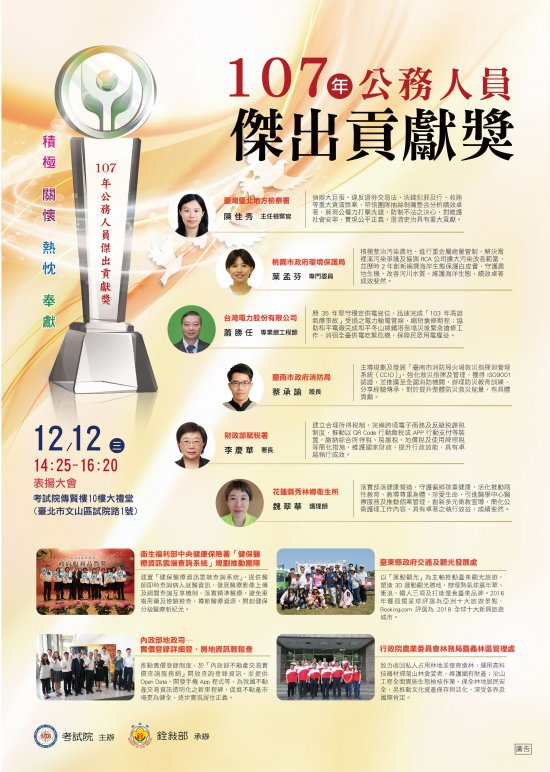 二、本( 107 )年公務人員傑出貢獻獎業經考試院組成評審委員會議,決議 6 名得獎人及 4 組得獎團體,為表揚得獎者傑出事蹟,考試院訂於本年 12 月 12 日(星期三)下午 2 時 25 分於考試院傳賢樓 10 樓大禮堂舉行表揚大會,茲檢附「107 年公務人員傑出貢獻獎表揚大會」電子海報 1 份,請惠予公告。