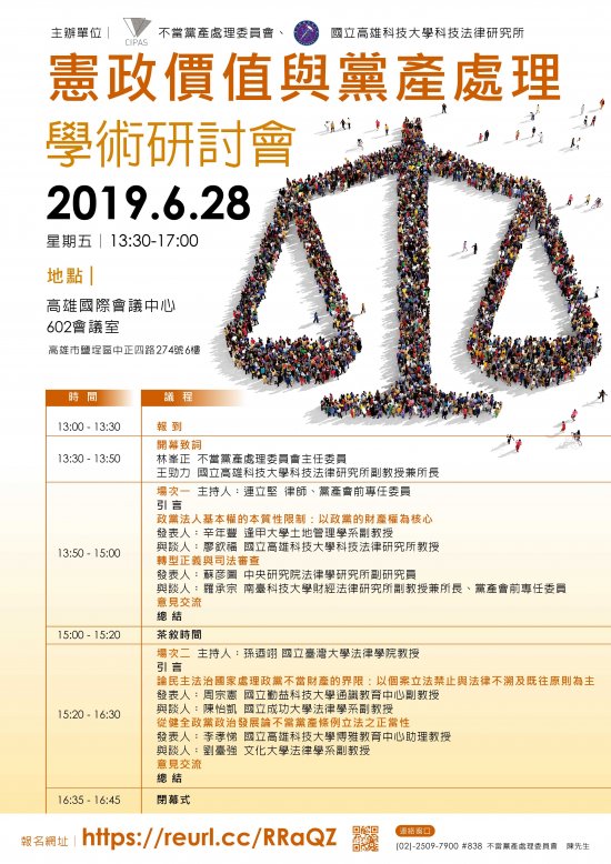一、依不當黨產處理委員會 108 年 6 月 3 日臺黨產調一字第 1080700250 號辦理。 二、本次研討會於 108 年 6 月 28 日(五)在高雄國際會議中心 602 會議室舉辦,研討會議程如附件,並自即日起至 6 月 21 日受理網路報名,報名詳情可參閱網站公告資訊(網址:https://www.cipas.gov.tw/news/256)。 三、檢附說明一來函、研討會海報及高雄國際會議中心會議場地交通資訊影本各一份。