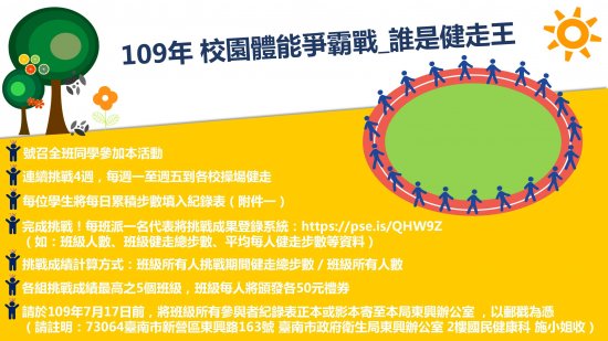 衛生局辦理 109 年「校園體能爭霸戰_誰是健走王」活動,請學生踴躍參加
