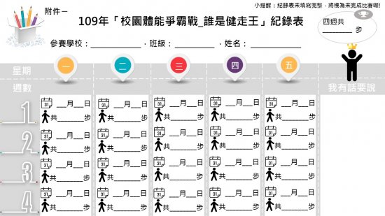 衛生局辦理109年「校園體能爭霸戰_誰是健走王」活動,請學生踴躍參加