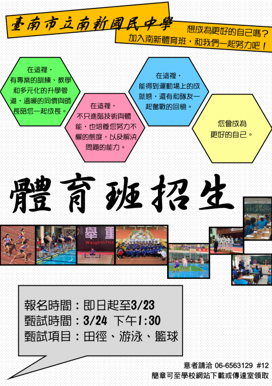 主旨:檢送本校 110 學年度體育班招生簡章、報名表及海報 1 份(如附件),請貴校協助宣導事宜,詳如說明,請 查照。