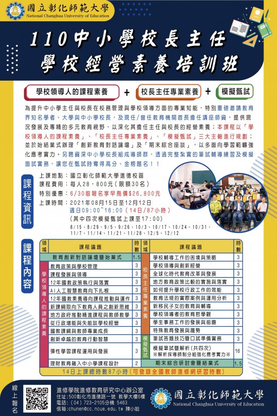 二、「110 年中小學校長、主任經營素養培訓班」 課程時間為 110 年 8 月 15 日至 12 月 12 日,共 14 日合計 87 小時,可登錄全國教師在職進修網研習時數,本課程以實體教學為主,本校視疫情狀況,配合中央疫情指揮中心公佈之防疫措施,若有必要部份課程得彈性改採線上進行,課程費用每人 28,800 元, 6/30 前報名享優惠價每人 26,800 元。