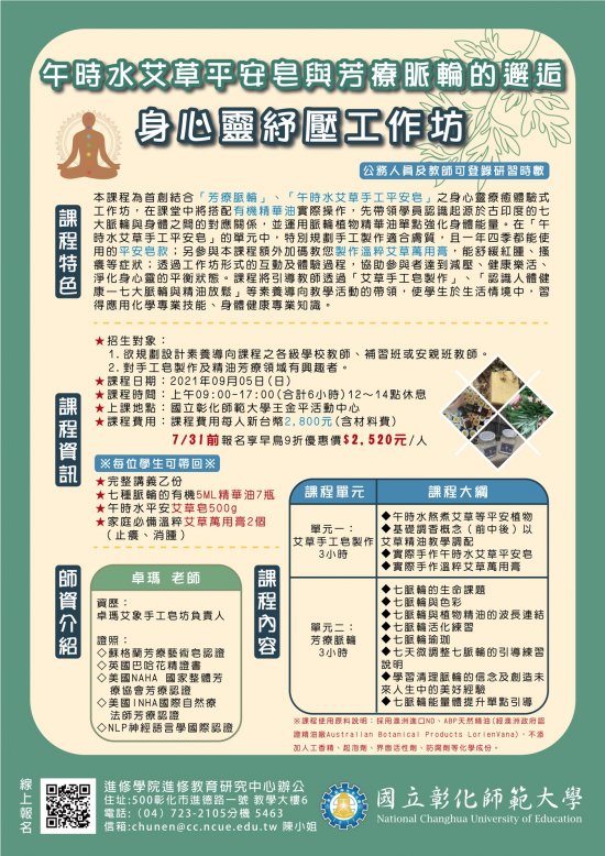 三、「午時水艾草皂與芳療脈輪的邂逅-身心靈紓壓工作坊」課程時間為 110 年 9 月 5 日(日) 上午 09:00-17:00 ,合計 6 小時,公務人員及教師可登錄研習時數,課程費用為每人 2,800 元(含材料費), 7/31 前報名享 9 折優惠價每人 2,520 元。