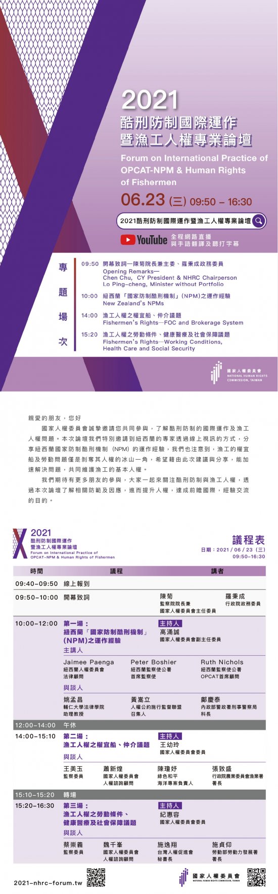 主旨:監察院國家人權委員會定於本(110)年 6 月 23 日(星期三)舉行「2021 酷刑防制國際運作暨漁工人權專業論壇」線上直播活動,請貴機關(學校、單位)轉知所屬參與並觀看,請查照。